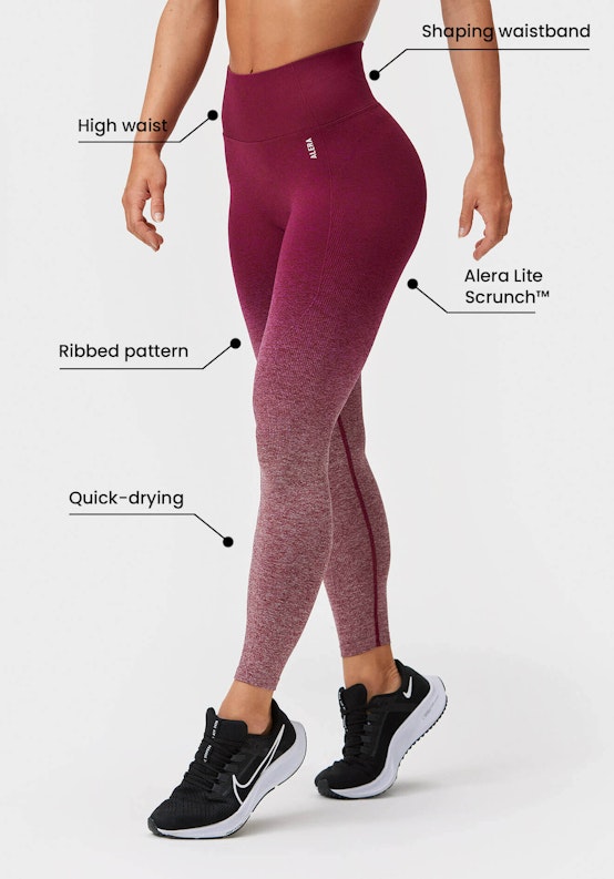 Förutom det otroligt sköna seamless-materialet med mycket bra andningsförmåga och som även är snabbtorkande, så har dessa tights en snygg 2-färgs design, ribbade mönsterdetaljer och scrunch-effekt.